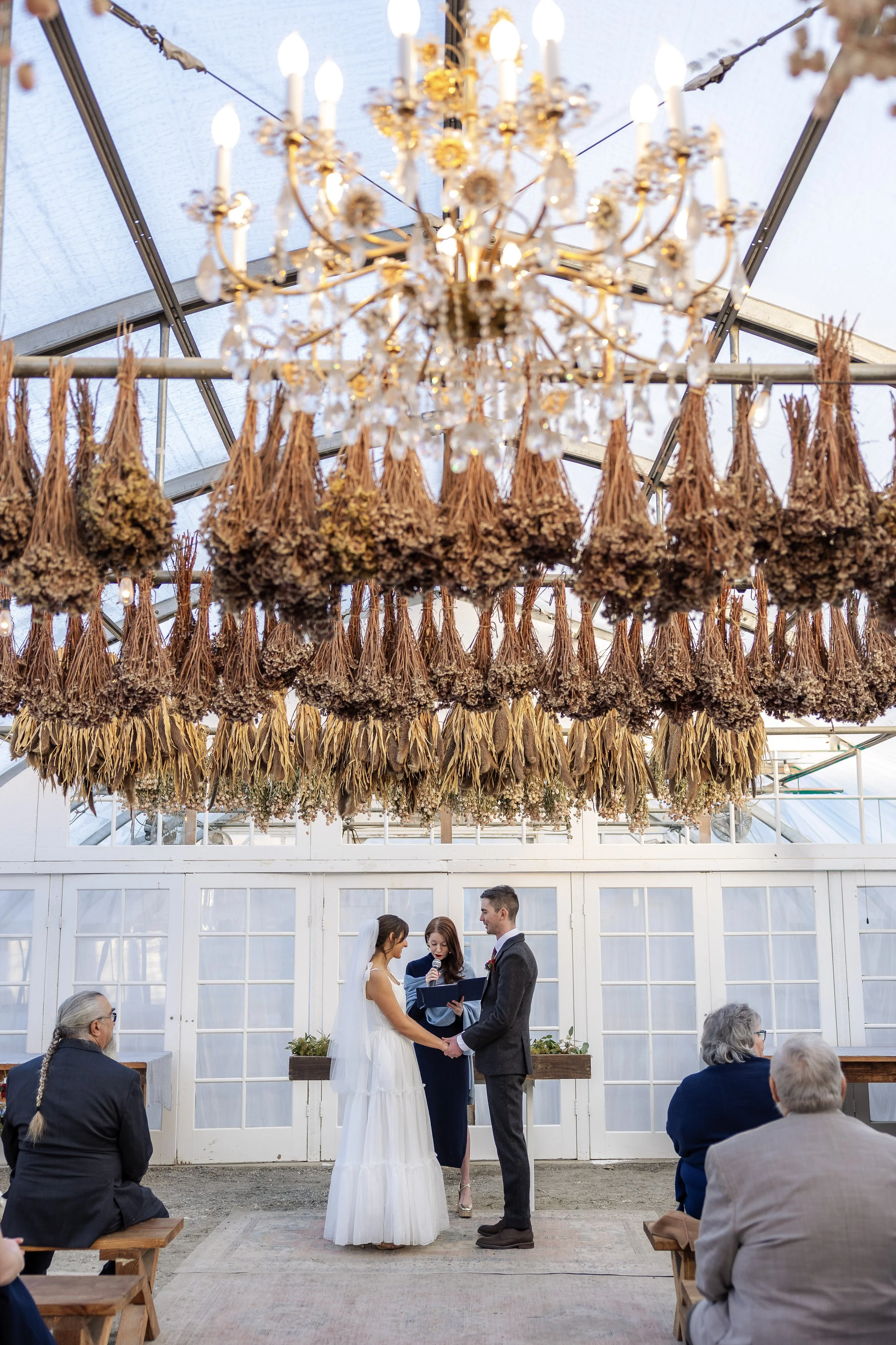Core aesthetic includes chandelier, hanging dried florals from rafters, bistro lighting