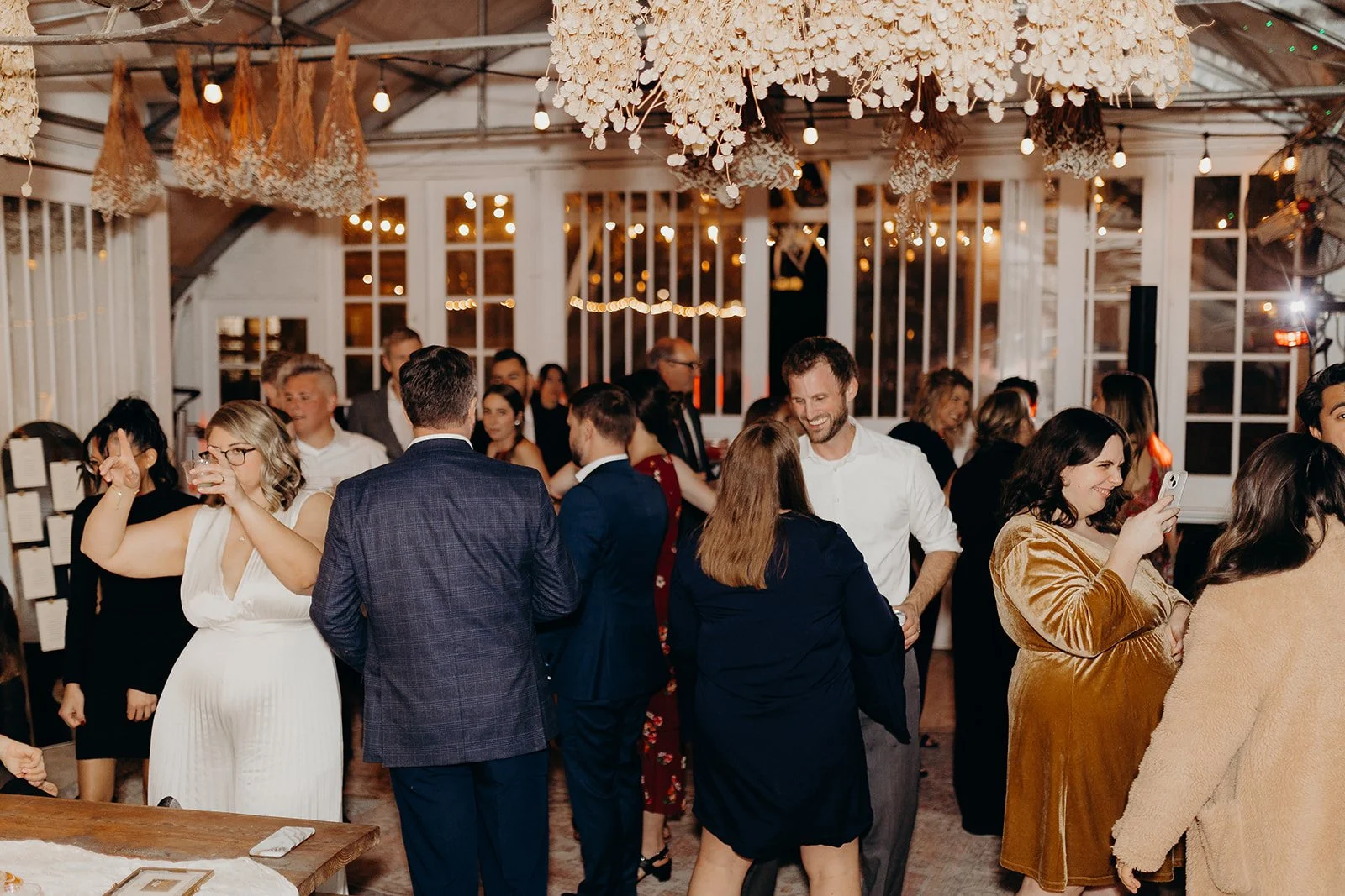 Core aesthetic includes chandelier, hanging dried florals from rafters, bistro lighting